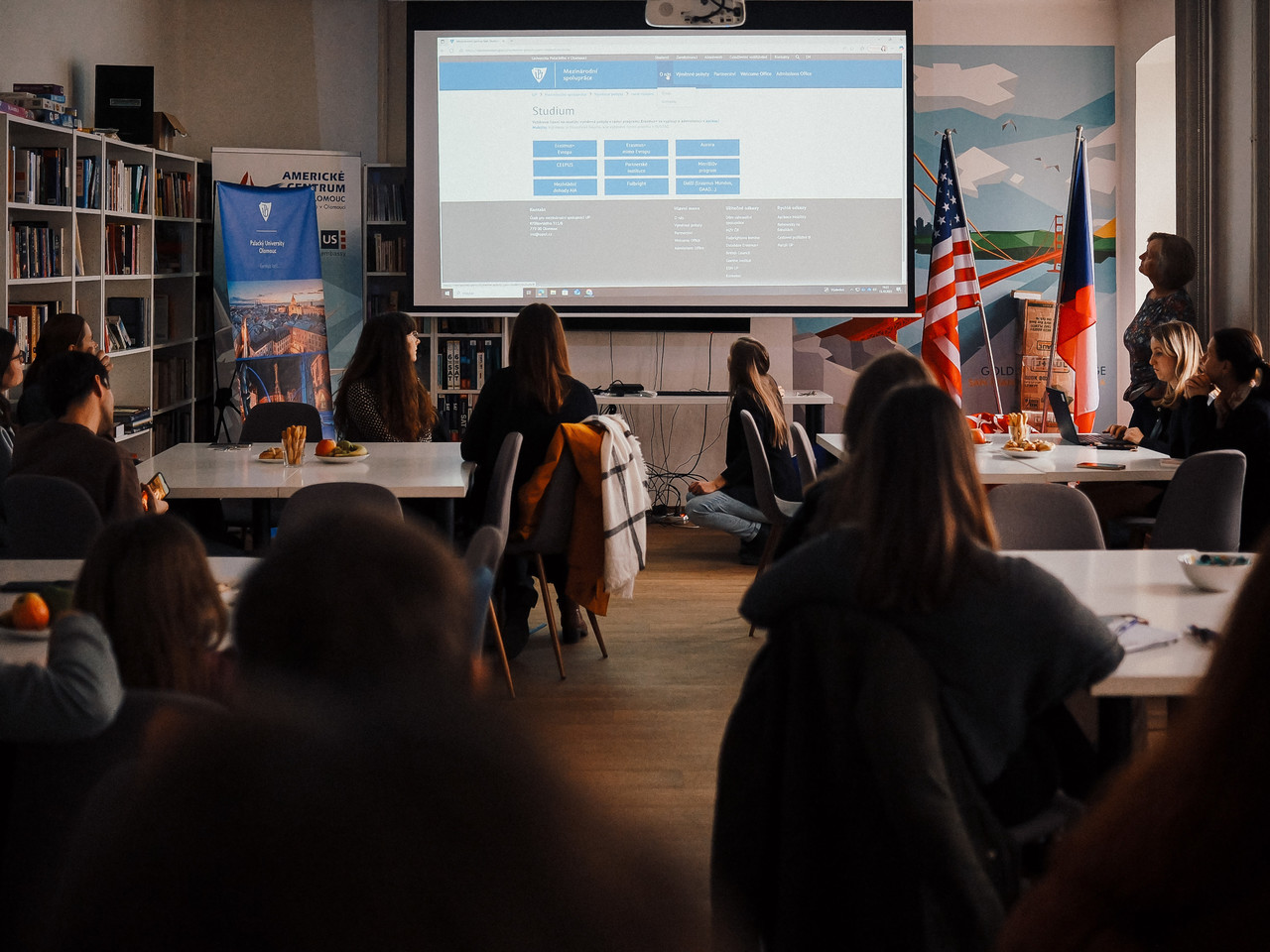 Ve středu 15. října odpoledne jsme otevřeli dveře našeho oddělení a uspořádali přátelské setkání s koordinátory programu Erasmus a také při této příležitosti představili Merrillův program, který nabízí stipendia pro studium na partnerských univerzitách v USA. Publikum zcela okouzlily absolventky Merrillova programu sdílením svých zkušeností se studiem v USA. Výzva pro podávání přihlášek na Merrillův program v akademickém roce 2026/2027 je aktuálně otevřena až do 8. prosince 2025. Momenty ze setkání zachytil fotograf Vojtěch Kmenta.