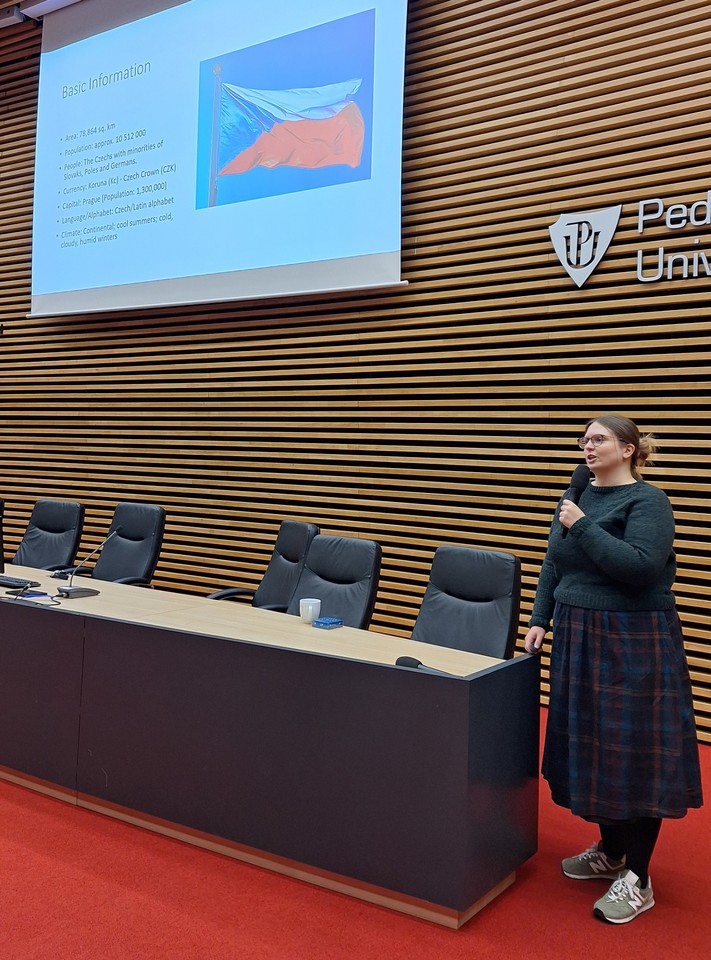 Nechyběla ani přednáška o České republice, naší kultuře, politice, historii ři stereotypech vedená vedoucí Oddělení pro partnerství, Mgr. Terezou Kalouskovou. Své (nově) nabité znalosti se studenti mohli otestovat během kvízů a tři nejlepší vyhrát malou pozornost.
