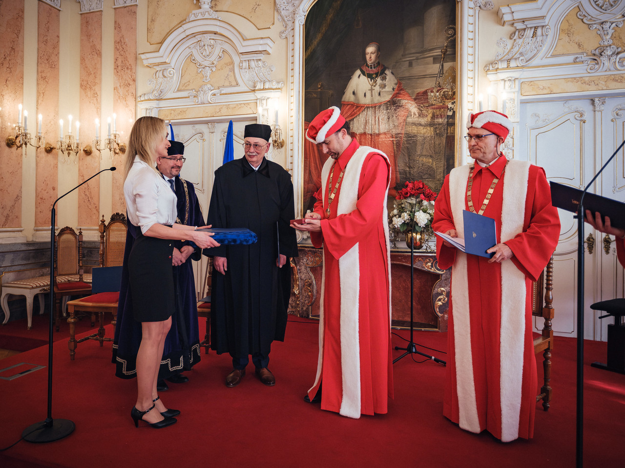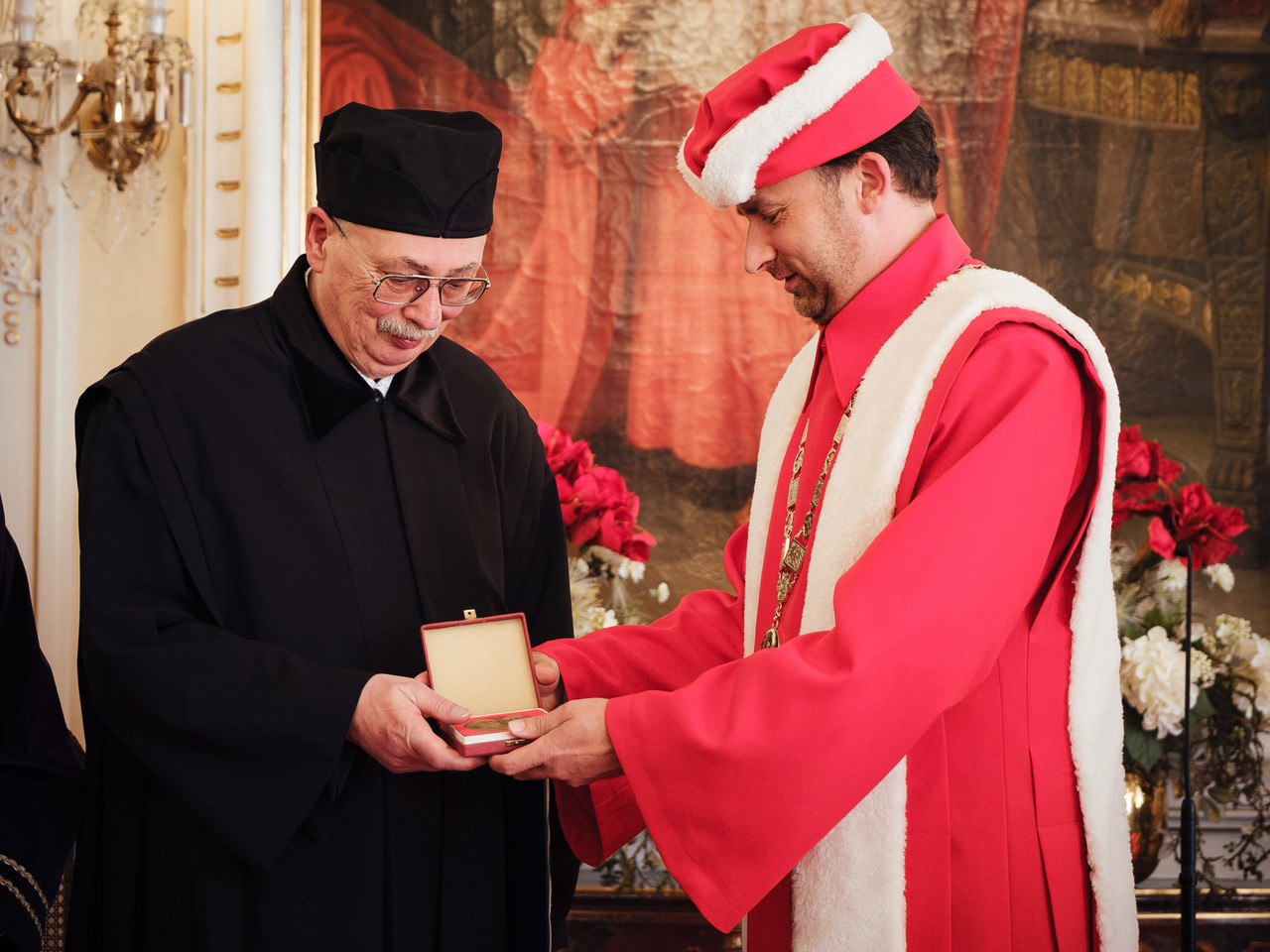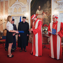 Representatives of the university then presented Karel Eliáš with an honorary doctorate in the form of a diploma and a commemorative UP medal with a double portrait of Josef Dobrovský and František Palacký.