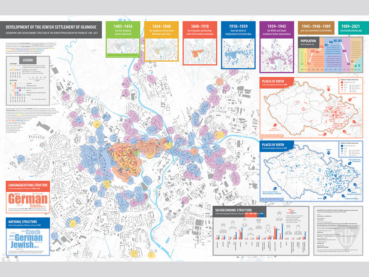 The map The Development of Jewish Settlement in Olomouc: The Geographical and Socioeconomic Structure of the Jewish Population in the Period 1180–2021 (VUP, 2022) was created with the support of the Ministry of Education, Youth, and Sports of the Czech Republic (project IGA_FF_2021_026). It is available in both print and digital formats on the website of the Center for Jewish Studies at the Faculty of Arts, Palacký University.