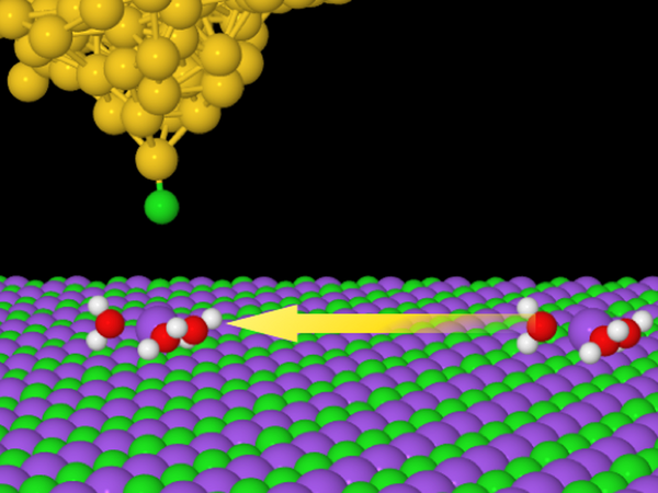 A schematic illustration of the induced movement of the ionic hydrate towards the tip of the microscope by means of an electric pulse. Research has shown that an ionic hydrate consisting of a single sodium atom (purple ball) surrounded by three molecules of water (hydrogen - white ball, oxygen - red ball) shows significantly greater mobility than other types of hydrate formed by a different number of water molecules. This finding demonstrates that the mobility of ion hydrates is greatly influenced by their structure.